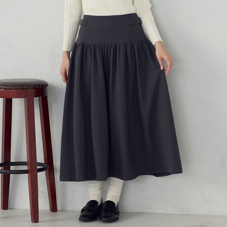 ミドルヒップで切り替えられ下の部分にはたっぷりとしたギャザーフレアが入り、
