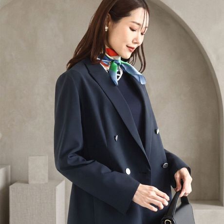 一枚できちんと見えが叶うオンオフ兼用のダブルジャケットです。長め丈のトップスをアウトで着ても裾がはみ出しにくい、ヒップまで隠れる着丈が安心。お仕事使いでインするのが苦手な方にも嬉しいポイントです。ややオーバーな程よいゆとりが羽織りやすく、抜け感があります。しなやかなドライタッチ素材でボクシーすぎず、肩幅が狭めの方や小柄さんにも馴染みやすいシルエットです。ロールアップした時の袖裏から覗くストライプがこなれた印象に。同素材のパンツ・スカートとセットアップで着用できます。デニムなどのカジュアルボトムとも相性が良く、デイリーで着回したい万能アイテムです。