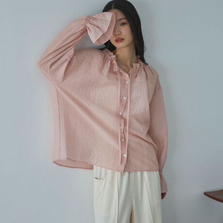 ・襟元にフリルをあしらった華やかな印象のスタンドカラーブラウス