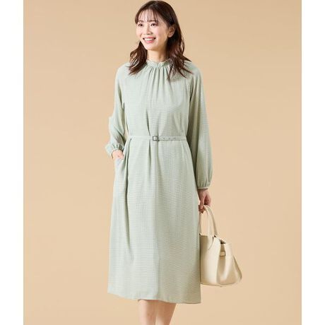 スタンドネックのギャザーが顔まわりを優しくまとめ、体のラインを拾いにくいフレアシルエットが1枚で“きちんと感”を演出します。また、歩くたびに軽やかに揺れる裾が、後ろ姿まで印象的に。付属のバックル付き共布ベルトでウエスト位置を調整すれば、スタイルアップも叶い、着る人を選ばない安心感が魅力です。両脇にはスラッシュポケットを備え、実用性も確保しました。裏地あり。