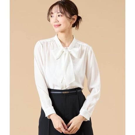 ヨーク部分にギャザーを寄せ、やわらかく女性らしい表情に仕上げたデザイン。大きめのボウタイは首元をすっきり見せつつ、1枚でもレイヤードでも存在感を発揮します。