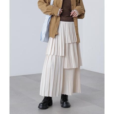 左右でプリーツのデザイン違いを楽しめるアシメスカート。落ち感のある生地で広がりすぎず、スッキリとしたシルエットです。柔らかい表情の3段消しプリーツティアードと、シャープでスッキリとした印象の2段プリーツが目を引くくデザイン。ひと癖ある表情と揺れるプリーツの動きがポイントです。ウエストゴム仕様ではき心地が良いです。スウェットやオフショルニット合わせがおすすめです。※モデルの着用画像の場合、光の当たり具合により、実際の色味と異なって見えることがございます。色味は、商品単体の画像をご参照ください。