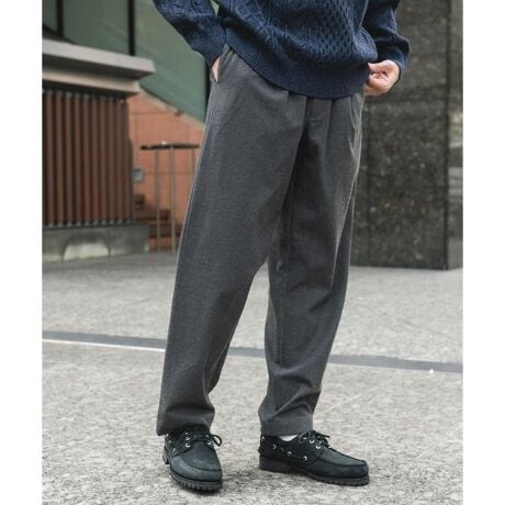 お休みの日のカジュアルパンツとして活躍してくれます。トラウザーなのでカジュアルなトップスからきれいめなトップスまで幅広く合わせられます。裾幅はほどよく広いためすっきりとした革靴からボリュームのあるシューズまで相性良く合わせていただけます。