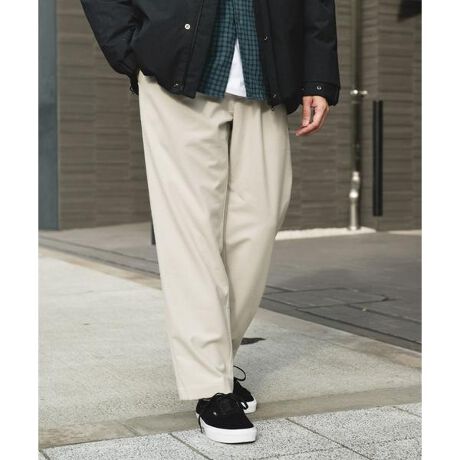 お休みの日のカジュアルパンツとして活躍してくれます。トラウザーなのでカジュアルなトップスからきれいめなトップスまで幅広く合わせられます。裾幅はほどよく広いためすっきりとした革靴からボリュームのあるシューズまで相性良く合わせていただけます。
