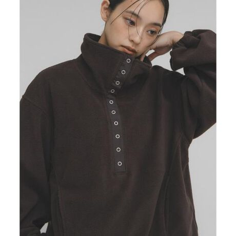 フリース素材を使用したプルオーバー。フロントがリングドット釦仕様で開くようになっており、前立てに異素材を採用しこだわりました。折り返して着ていただくと抜け感が出るのでおすすめです。また、裾にドローコードが設定されているのでお好みで調整可能なとろもポイントです。