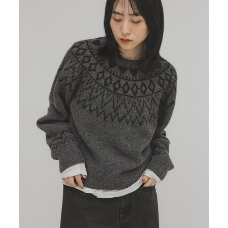 冬にぴったりな季節感たっぷりのノルディック柄を使用したニット。身体のラインを拾い過ぎない程よいシルエットは大人カジュアルコーデにぴったりです。デニムやワイドパンツを合わせたリラクシーなスタイルから、女性らしいスカートまで幅広く楽しめます。