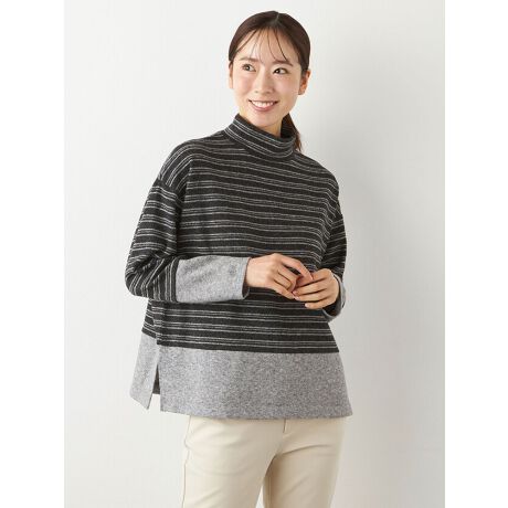 [型番:6250736][型番:6250736]ざっくりと編まれたニットライクなボーダータートルカットソー。袖と裾に無地カラーをドッキングしてアクセントをつけています。ゆったりとした身巾でリラックス感のあるシルエットながらカットソー素材なのでニットの様に着ぶくれすることなくダウンなどの防寒アウターのインナーとしても快適に着用できます。