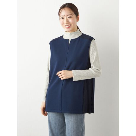 [型番:6250107][型番:6250107]あたたかな裏起毛のジャージー素材に縄柄のニット編地をドッキングさせたAラインベスト。ほど良いゆとりがありながらも、胸もとのキーネックとサイドのニット編みでですっきり着こなせるデザイン。肩とサイドの縄編みがシックなスタイルに個性をプラスしています。素材の温かさ、肌触り、着心地の良さが他にはない1枚です。プラスオンするだけで暖かく上品なお出かけコーデの完成です。