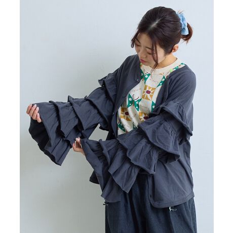 ボリュームたっぷりのフリルが袖に連なった、キュートな存在感のある1枚。