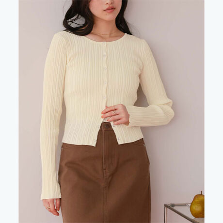 ・リングドットデザインがポイント、ベーシックニットカーディガン・ランダムリブがシンプルなデザインにアクセント◎・薄手のシャリ感のあるニット素材・身体にフィットするサイズ感なので1枚着で大活躍・お好みで前後2wayで着用可能です[型番:AHXT0502]