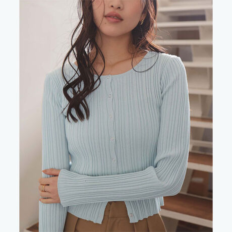 ・リングドットデザインがポイント、ベーシックニットカーディガン・ランダムリブがシンプルなデザインにアクセント◎・薄手のシャリ感のあるニット素材・身体にフィットするサイズ感なので1枚着で大活躍・お好みで前後2wayで着用可能です[型番:AHXT0502]