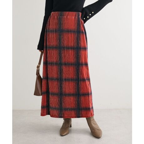 大胆にプリントされたチェック柄が目を惹くIラインスカート。シボ感ある楊柳と光沢を持つベロアを組み合わせた表情豊かな生地がスタイリングを上品に仕上げます。ウエストゴム仕様で穿き心地も抜群。シンプルなトップスと合わせるだけでコーディネートが完成するおすすめの一着です。透け感[なし]