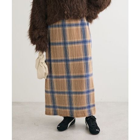 大胆にプリントされたチェック柄が目を惹くIラインスカート。シボ感ある楊柳と光沢を持つベロアを組み合わせた表情豊かな生地がスタイリングを上品に仕上げます。ウエストゴム仕様で穿き心地も抜群。シンプルなトップスと合わせるだけでコーディネートが完成するおすすめの一着です。透け感[なし]