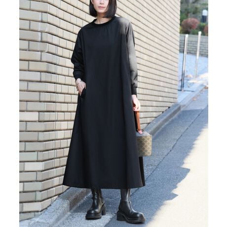 やや首元の詰まった一枚でサマになる綿100%のAラインワンピース。
