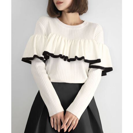 デコルテから袖にかけてあしらわれたフリルが華やかなニットトップス。