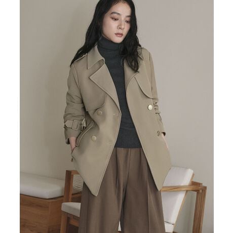 トレンチ風のデザインが目を惹く、上品な印象のハーフコート。