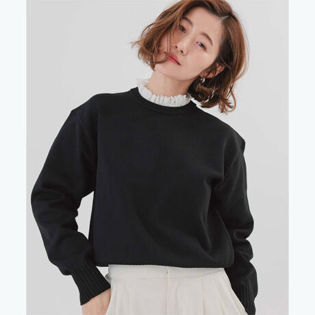 ニット素材ながらも形をきれいに保つため、スウェット感覚で着られつつも上品な印象をキープ。