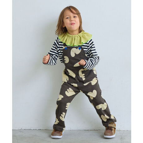 インパクトのある総柄プリントが目を引く、ミニ裏毛素材のサロペット。