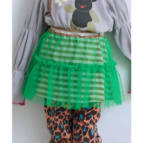 ボーダー柄のスカートにチュールを重ねた異素材レイヤードデザイン
