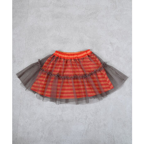 ボーダー柄のスカートにチュールを重ねた異素材レイヤードデザイン