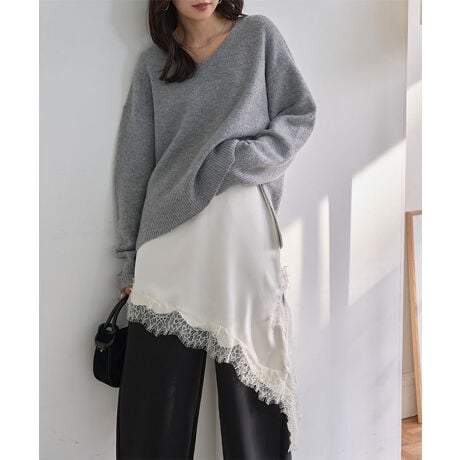 艶やかなサテンと繊細なレースが大人の魅力を引き立てる、サテンレースアシメロングキャミソール。