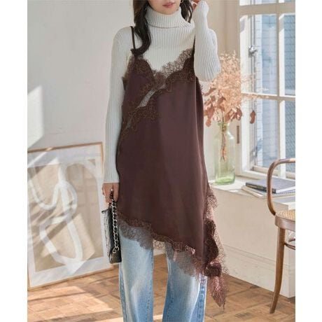 艶やかなサテンと繊細なレースが大人の魅力を引き立てる、サテンレースアシメロングキャミソール。
