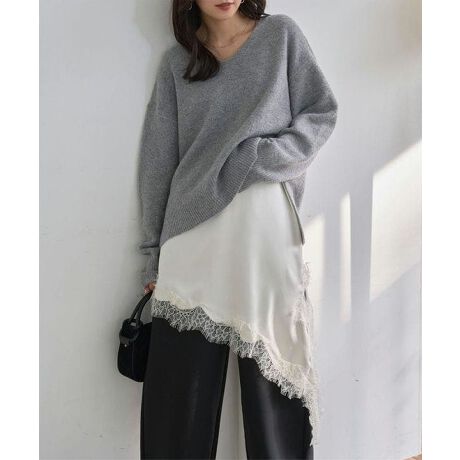 艶やかなサテンと繊細なレースが大人の魅力を引き立てる、サテンレースアシメロングキャミソール。