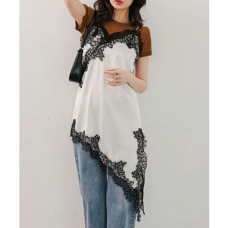 艶やかなサテンと繊細なレースが大人の魅力を引き立てる、サテンレースアシメロングキャミソール。