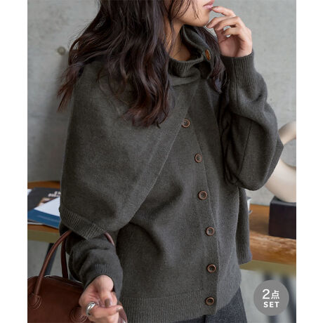 ケープ風に肩に巻いたり、ビスチェトップスとしてレイヤードスタイルにも着回し可能なケープとベーシックなクルーネックニット。