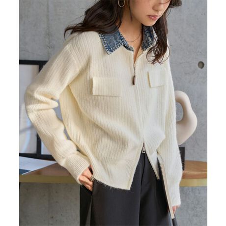 デニム襟がさりげないアクセントになる、ジップニットカーディガン。
