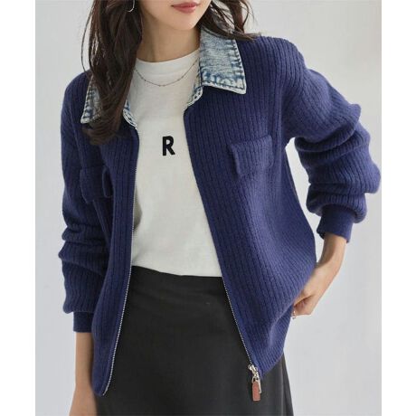 デニム襟がさりげないアクセントになる、ジップニットカーディガン。