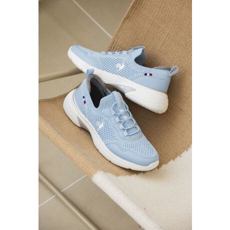 屈曲性と安定性にこだわった、ランニングスタイル。 『ワイド設計(3E相当)』でゆったりとした履き心地ながら、スタイリッシュなシルエットに仕上げています。アッパーは柔らかく足にフィットするニット仕様で、着用シーンを広げます。自然界で分解されにくいフッ素加工物を一切使用しないC0はっ水剤を使用。(※はっ水機能を保証するものではありません。)シューレースは脱ぎ履きがしやすいようにゴム紐を使用しています。ソールは大胆なスリットを入れるとともに、中足部をTPUシャンク構造にすることで、屈曲性と歩行時の足の捻じれを考慮したデザインに仕上げました。安定性にこだわり足がスムーズに前に前に行くような履き心地を意識しました。インソールには消臭低反発インソールを採用。ヒール部分にはフランスのブランドらしいエレガントなデザイン落とし込み、上品な印象に。女性らしいカラーを採用することで機能性とデザイン性を両立させました。