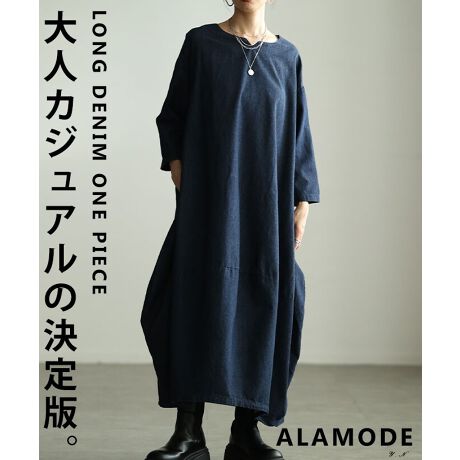 【ワンピース】ロング デニム ゆったり カジュアル シンプル ブルー 体型カバー 春 秋 冬