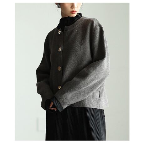 存在感のあるメタルボタンが特徴のスポンジニットカーディガンです。丸首で上品に、立体感のあるシルエットでニットジャケットとしてもご着用いただけます。