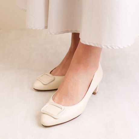 ・同系色で仕上げたバックルモチーフが、上品で優しい印象の足元に仕上がるパンプス。