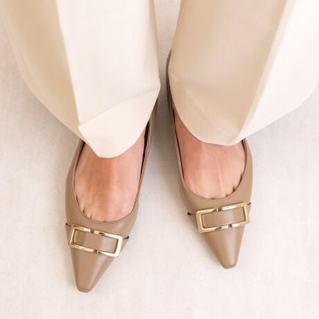 ・抜け感のあるスクエア型バックルが、ハンサムなスタイリングを格上げしてくれるフラットパンプス。