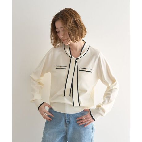 Vネックにはボウタイリボンを施しフェミニンなアクセントをプラス。