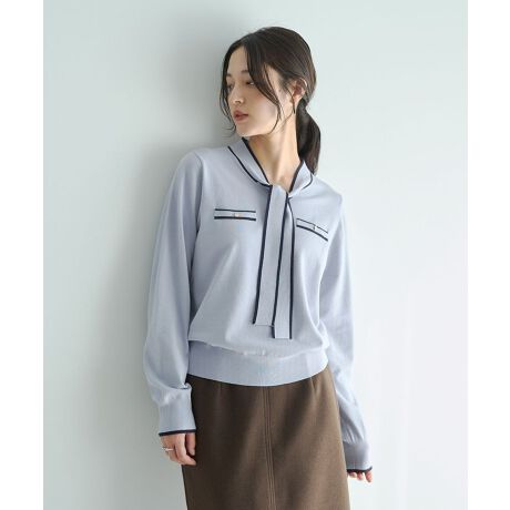 Vネックにはボウタイリボンを施しフェミニンなアクセントをプラス。
