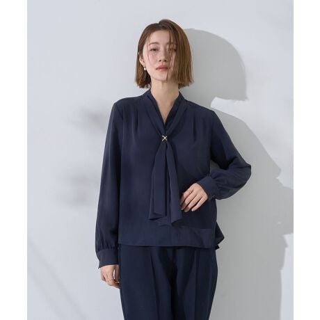 落ち感のある素材で仕立てた、美しいドレープが魅力のボウタイブラウス。スカーフリングでボウタイの表情を自在にアレンジ可能。きちんと感を出したい日はコンパクトにまとめ、こなれた印象にしたい日はラフに垂らすなど、簡単に印象の変化を楽しめます。きれいめなデザインながらもモードな抜け感があり、一枚でもジャケットインでも映えるおすすめアイテムです。