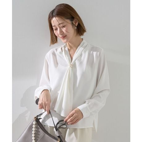 落ち感のある素材で仕立てた、美しいドレープが魅力のボウタイブラウス。スカーフリングでボウタイの表情を自在にアレンジ可能。きちんと感を出したい日はコンパクトにまとめ、こなれた印象にしたい日はラフに垂らすなど、簡単に印象の変化を楽しめます。きれいめなデザインながらもモードな抜け感があり、一枚でもジャケットインでも映えるおすすめアイテムです。