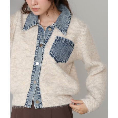 ニットのやわらかさとデニムのカジュアルさを掛け合わせた、デニム切替ニットカーディガン。衿・前立て・ポケットにデニム素材をあしらうことで、シンプルながらも程よく存在感のあるデザインに仕上げています。コンパクトすぎないシルエットで、ボタンを閉じてトップス風に着ても、羽織としても活躍。落ち着いたアイボリー、グレー、チャコールグレーの3色展開で、大人のデイリースタイルに自然と馴染む一枚です。