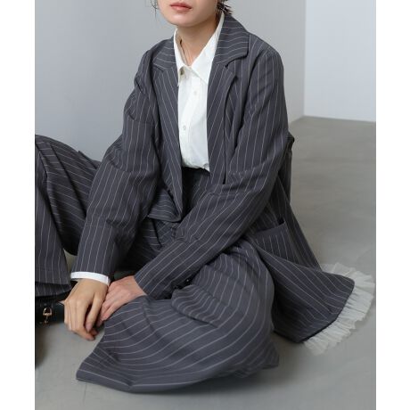 裾にあしらったフリルチュールが目を引く、ダブル仕様のテーラードジャケット。きちんと感のあるシルエットに、甘さをプラスしたデザインで、オンオフ問わず着回しやすい一着です。裾のチュールは取り外し可能なので、シーンや気分に合わせて表情を変えられるのも嬉しいポイント。同素材のジレとパンツと合わせれば、セットアップとしても楽しめ、単品使いでもコーデの主役に。チャコール・ベージュ・ストライプの3色展開で、それぞれ異なる雰囲気を演出します。