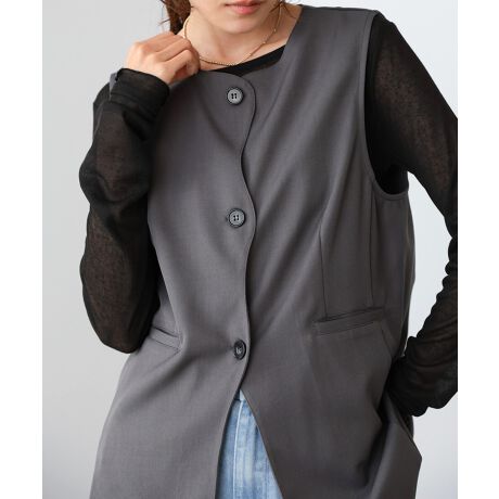 ジャケットと合わせて着られる、洗練された印象のウェーブジレ。すっきりとしたノーカラーデザインに、やわらかな曲線を描くシルエットが女性らしさを引き立てます。縦ラインを強調する程よいロング丈で、羽織るだけでスタイルアップが叶うのも嬉しいポイント。シンプルながらも存在感があり、ジャケットのインナーとしてはもちろん、単品でも着映えする一枚です。カラーはチャコール・ベージュ・ストライプの3色展開で、セットアップでも単品でも幅広く活躍します。