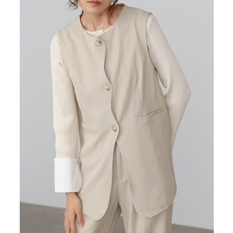 ジャケットと合わせて着られる、洗練された印象のウェーブジレ。すっきりとしたノーカラーデザインに、やわらかな曲線を描くシルエットが女性らしさを引き立てます。縦ラインを強調する程よいロング丈で、羽織るだけでスタイルアップが叶うのも嬉しいポイント。シンプルながらも存在感があり、ジャケットのインナーとしてはもちろん、単品でも着映えする一枚です。カラーはチャコール・ベージュ・ストライプの3色展開で、セットアップでも単品でも幅広く活躍します。
