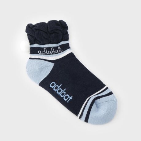 履き口のフリルと小さなポンポンが遊び心のあるアクセントとなり、足元を華やかに彩ります。