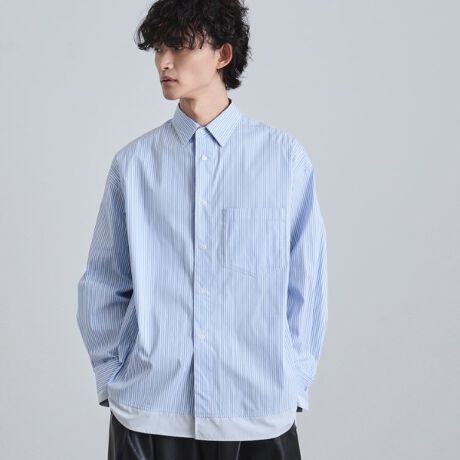ストライプシャツに無地のシャツを重ねたような、フェイクレイヤードデザインが特徴のレギュラーカラーシャツ。