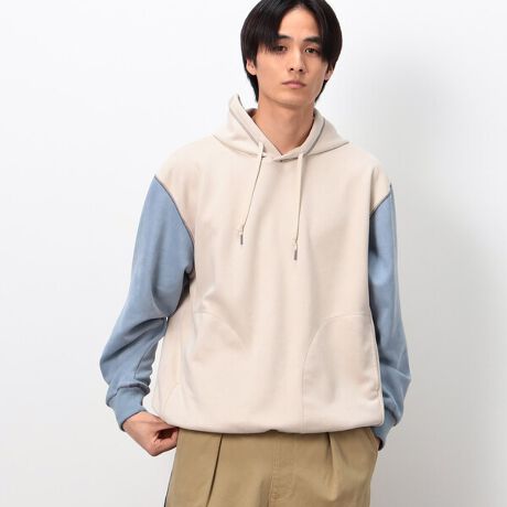 配色ステッチと身頃の切り替えがデザインポイントのゆったりとしたサイズ感のプルオーバーパーカです。