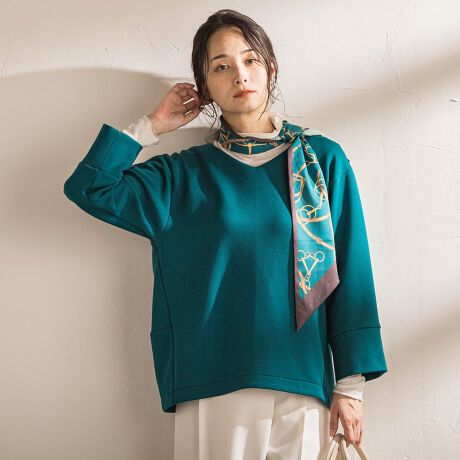 シンプルながら、暖かさ・カラー・きれい見えの三拍子が楽しめる万能トップスです。
