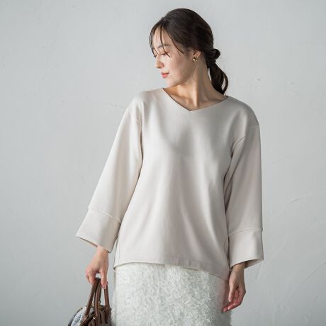 ほどよい抜け感のあるVラインが、顔まわりをすっきりと見せてくれる大人シルエットです。