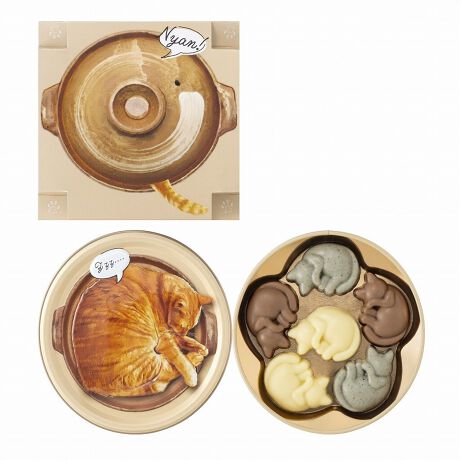 鍋の中で丸まっている猫ちゃんたちの姿は癒しそのものです。スリーブに鍋の蓋をデザインし、スリーブを取ると鍋に入っている猫ちゃんが現れる仕掛けもポイントです。丸まっている猫型チョコレート3種をねこにゃべ缶に詰め合わせました。